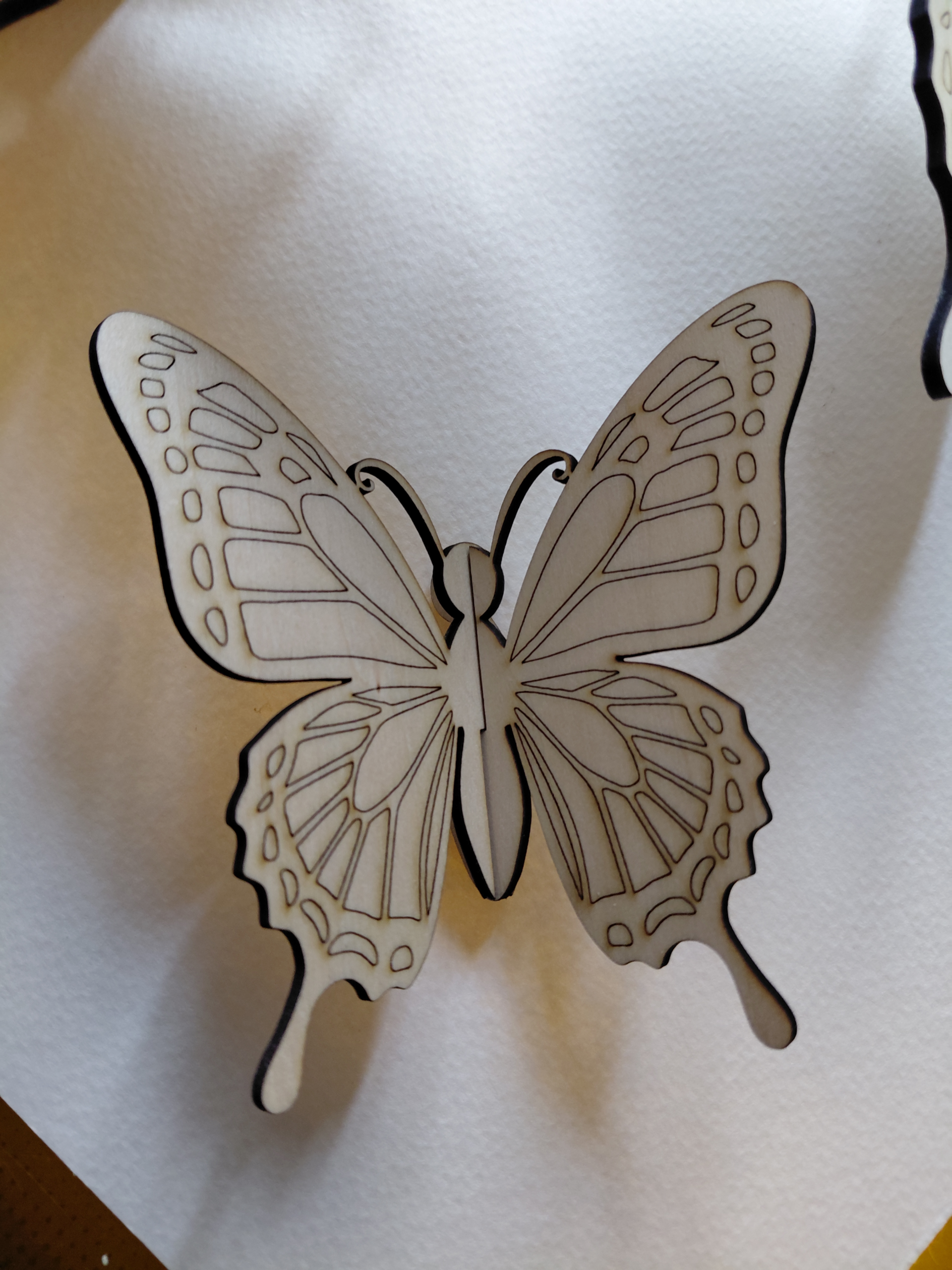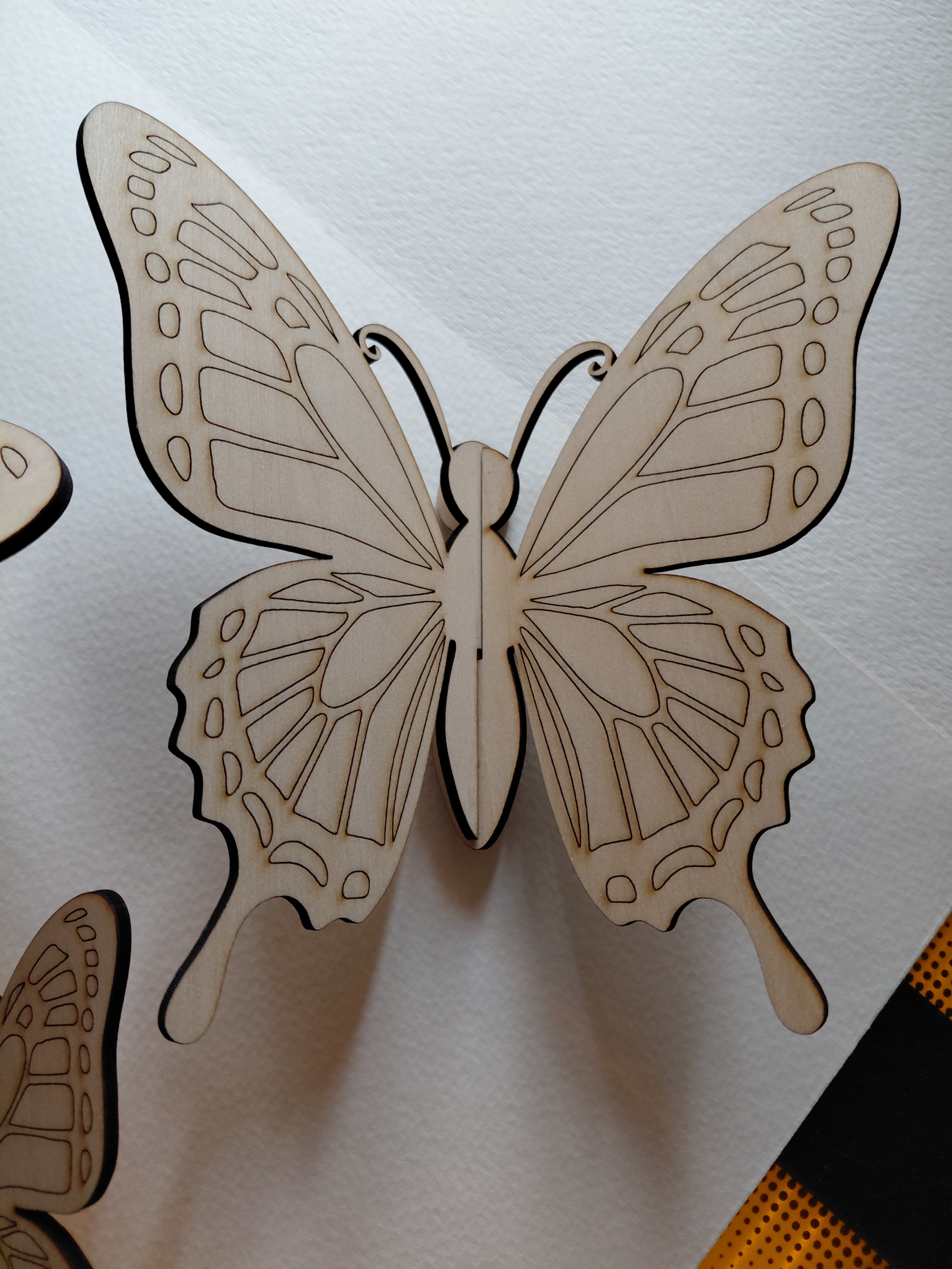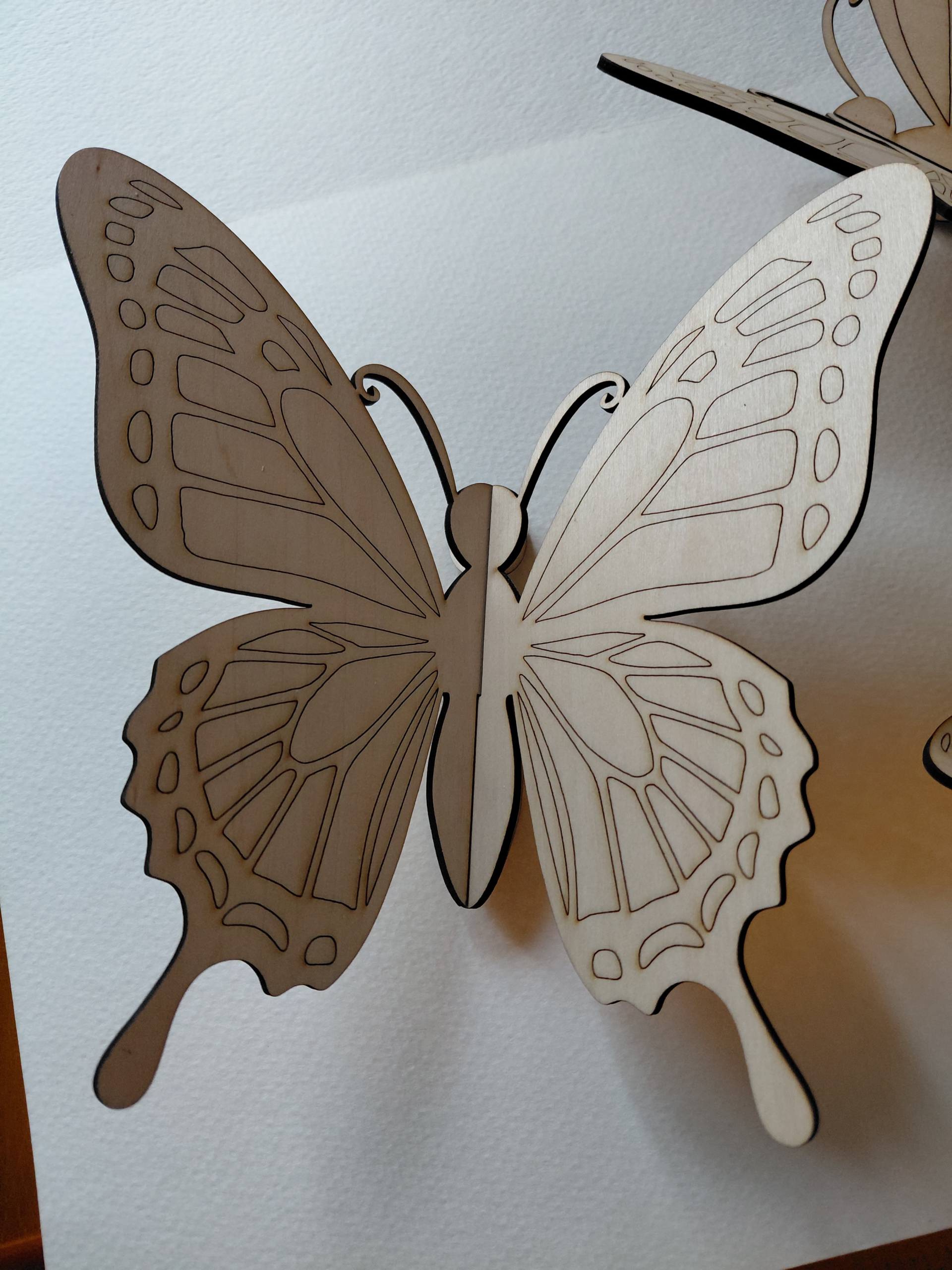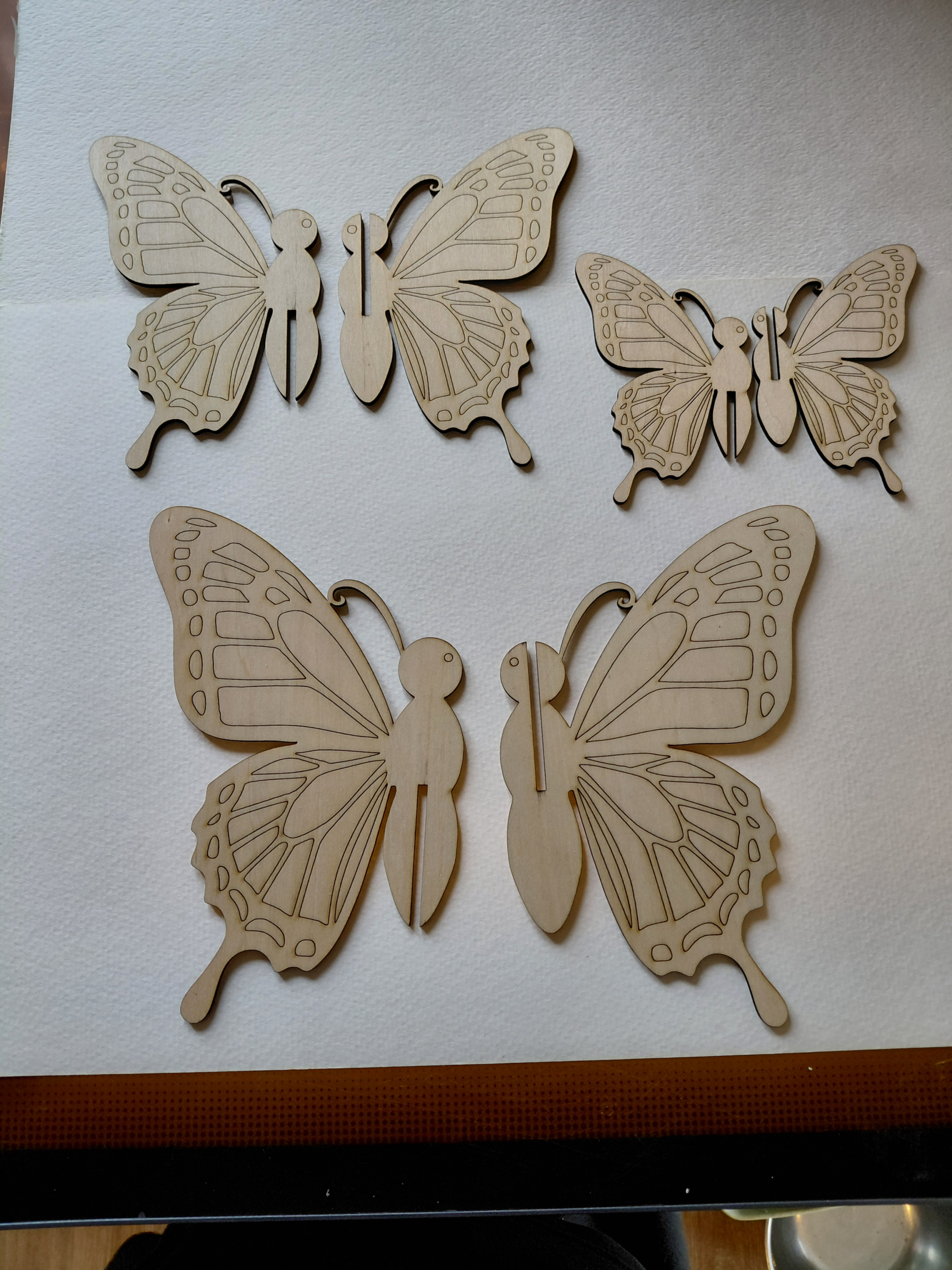 The product is a set of unfinished laser engraved wood butterflies, ready to paint, perfect for crafting projects. These butterflies are made of 3mm basswood and fit together to make a beautiful butterfly shape, ideal for adding a touch of nature to various craft projects.